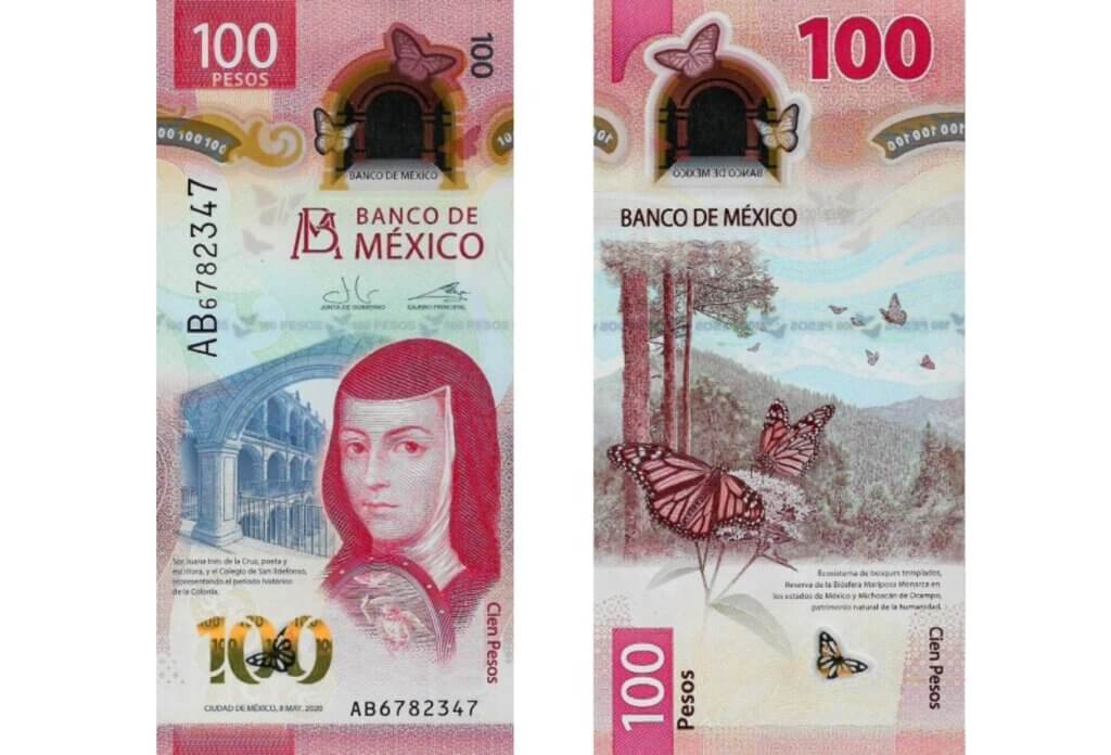 A nyertes bankjegy – rendhagyó módon – függőleges formátumú, és polimer alapú, ezáltal vízálló, tartósabb, és szinte lehetetlen hamisítani. A 100 pesóson Mexikó egyik hősnője, költője és írója szerepel: Sor Juana Inés de la Cruz. A bankjegy hátulján pedig – az ország egyik büszkesége – a Mariposa Monarcha Bioszféra-Rezervátum látható, amit a királylepkék telelőhelyének hoztak létre.
