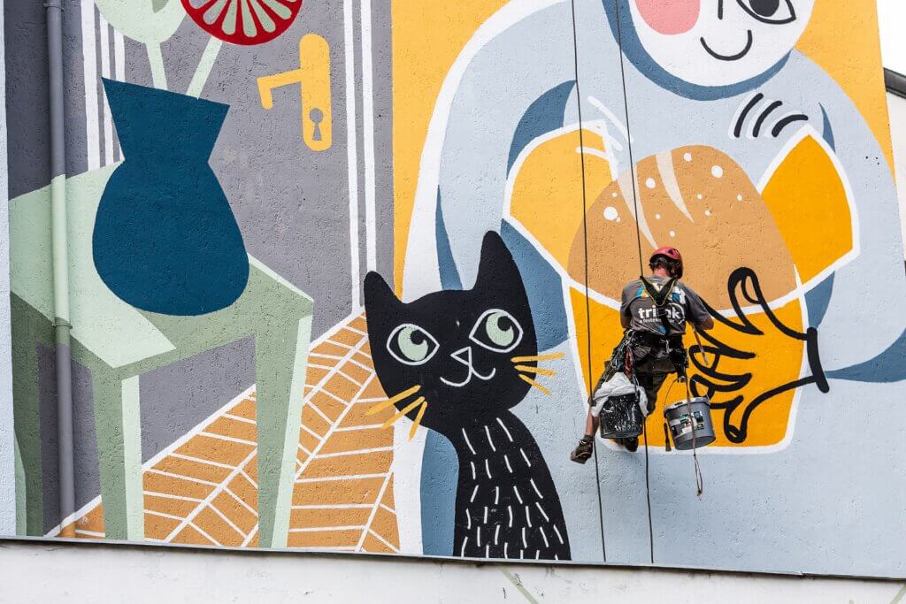 Új színes falfestmény díszíti a belvárosi Károly körúton álló Tűzoltóság homlokzatát. A kovász is lehet híd című alkotás Hitka Viktória képzőművész rajza alapján készült.