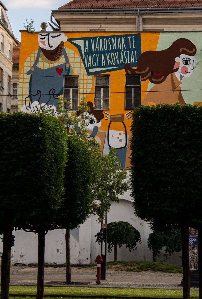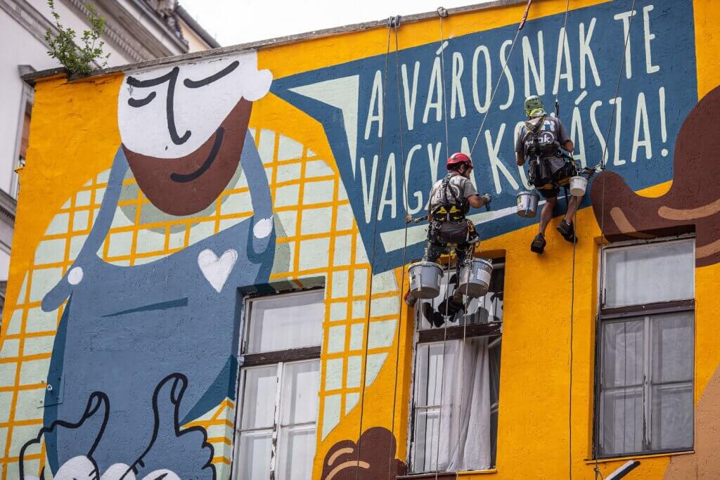 Az új alkotás minden budapesti előtt szeretne tisztelegni és köszönetet mondani, amiért a járványügyi helyzetben is figyeltek egymásra és képesek voltak a valódi összefogásra. A festményt egyébként Magyarország első tűzfalfestő szervezete, a Színes Város Csoport varázsolta a tűzfalra és a Budapesti Városarculati Nonprofit Kft. felkérésére született. A főváros városarculati cége a képpel a szolidaritás és az összetartozás üzenetét kívánta megjeleníteni, de arra is rámutat, hogy nincs mitől félnünk; ha baj van, valóban számíthatunk egymásra.