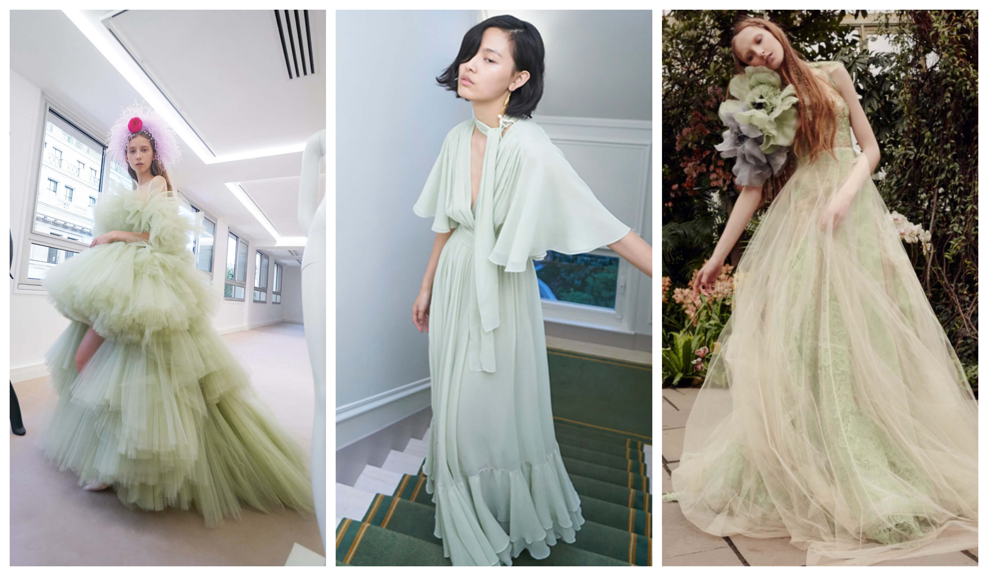 A pasztell rózsaszín után idén a pisztáciazöld különböző árnyalatai törik meg a klasszikus fehér ruhák sorát. A szín rengeteg nemzetközi divatház kifutóján feltűnt, például Vera Wang és Monique Lhuillier esküvői kollekciójában is fontos szerephez jutott. A légies, visszafogott ruhákat a különleges szín teszi izgalmassá, amihez akár más halvány színekbe borított fodrok és virágminták is párosulhatnak.