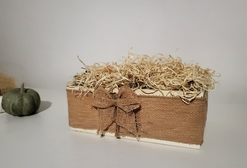A díszt mi ezúttal egy faládában képzeltük el, amit a Kikben, a Tediben és a hobbiboltokban is megvásárolhattok. A célnak egyébként ezenkívül sok minden más is megfelel, így például bármilyen nem használt ládika, kaspó vagy cserép is megfelelő alapot adhat.