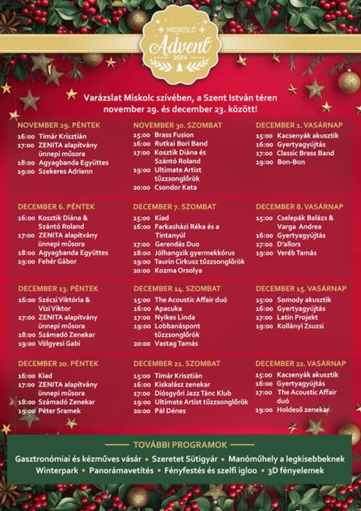 Mellettük olyan ismert magyar előadók is az adventi forgatag színpadáról szórakoztatják majd a közönséget, mint Szekeres Adrienn, Csondor Kata, Vastag Tamás, Kollányi Zsuzsi, Péter Sramek vagy a miskolci születésű Pál Dénes. De az érdeklődők ezenkívül még a Bon-Bon, a Számadó Zenekar és a Holdeső együttes műsorát is megtekinthetik majd. Mindemellett természetesen az adventi időszak vasárnapjain a hagyományos adventi gyertyagyújtást is megszervezik.
