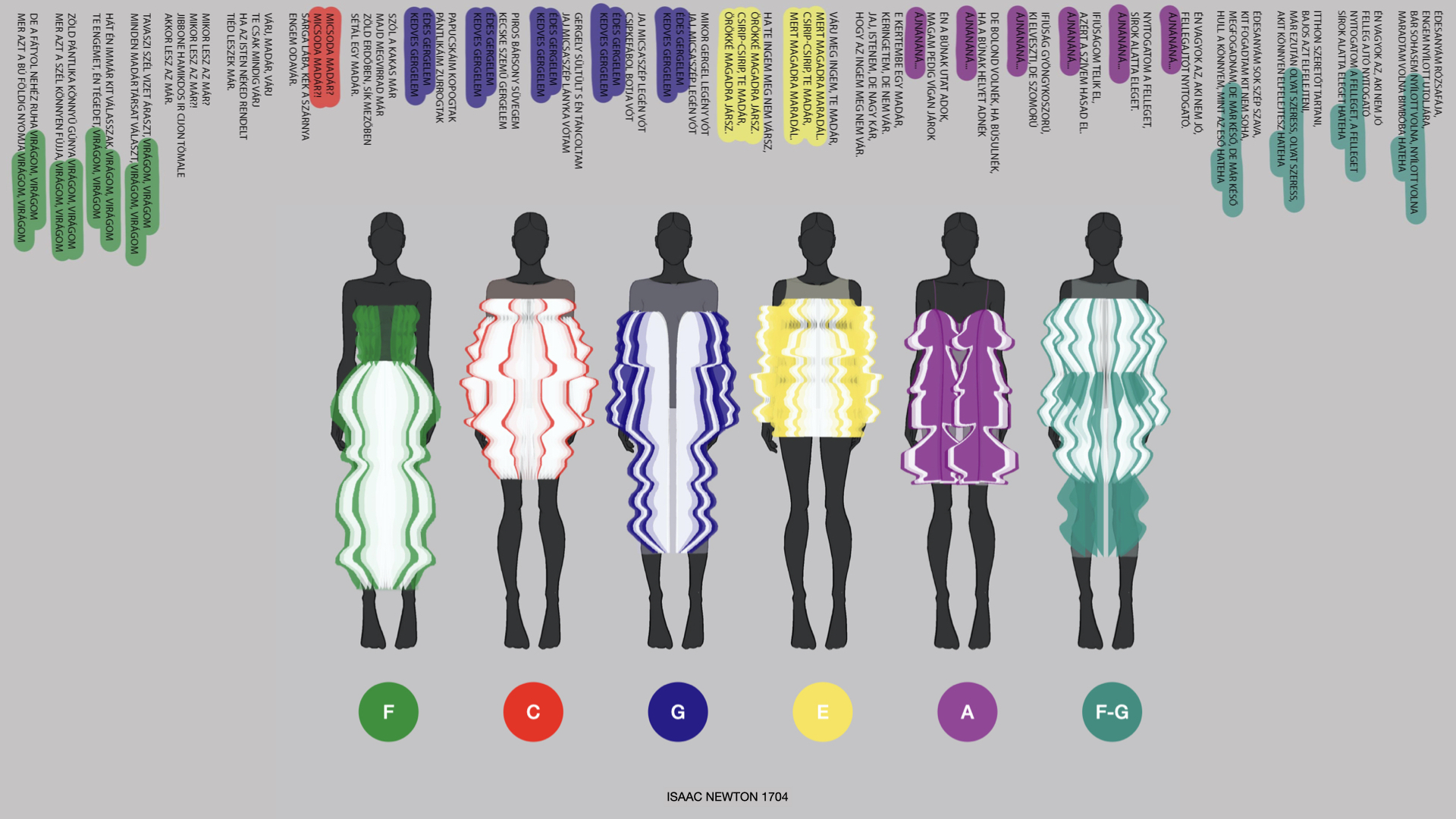 A dallam mellett a népdalok más tulajdonságai, például a szöveg is befolyásolta Emese kollekcióját. ‚‚A sorok és a versszakok hosszúsága, illetve ezek váltakozása és ismétlődése alapján határoztam meg a ruhák színét és hosszát. A színek esetében Isaac Newton 1704-es hang-szín analógiáját használtam és aszerint soroltam be őket, milyen hangról indul a dallamuk.’’ Így a Tavaszi szél vizet áraszt maxi ruhaként, az E kertemben című dal pedig sárga miniként elevenedik meg Emese meseszerű kollekciójában.