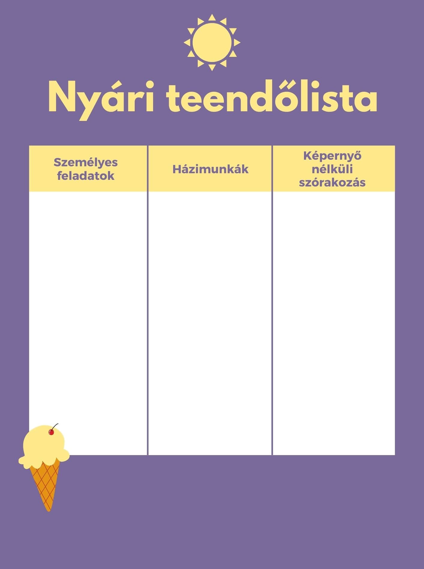 Bár a gyermeked elsőre talán túl szigorúnak tarthatják ezeket a szabályokat, szerencsére játékos módon is bevezetheted a WHO „előírásait” az otthonotokban. Készíts egy teendőlistát, amire felvezeted azokat a személyes feladatokat (mint például a fogmosás, a reggelizés, a felöltözés) vagy házimunkákat (ide sorolhatod a játékok elpakolását, a háziállat megetetését, vagy azt, hogy pakolja el maga után a koszos edényeket a mosogatóba), amelyeket el kell végeznie, mielőtt bármilyen technikai kütyüért nyúlna. De írj fel néhány olyan képernyőmentes tevékenységet is, amik közül szintén ki kell pipálnia párat. Ilyen lehet az olvasás (legalább 30 percig), egy óra játék a szabadban vagy a színezés. Íme a mi változatunk a gyerkőcök nyári to-do listájára: mentsd le, nyomtasd ki és töltsétek ki együtt!